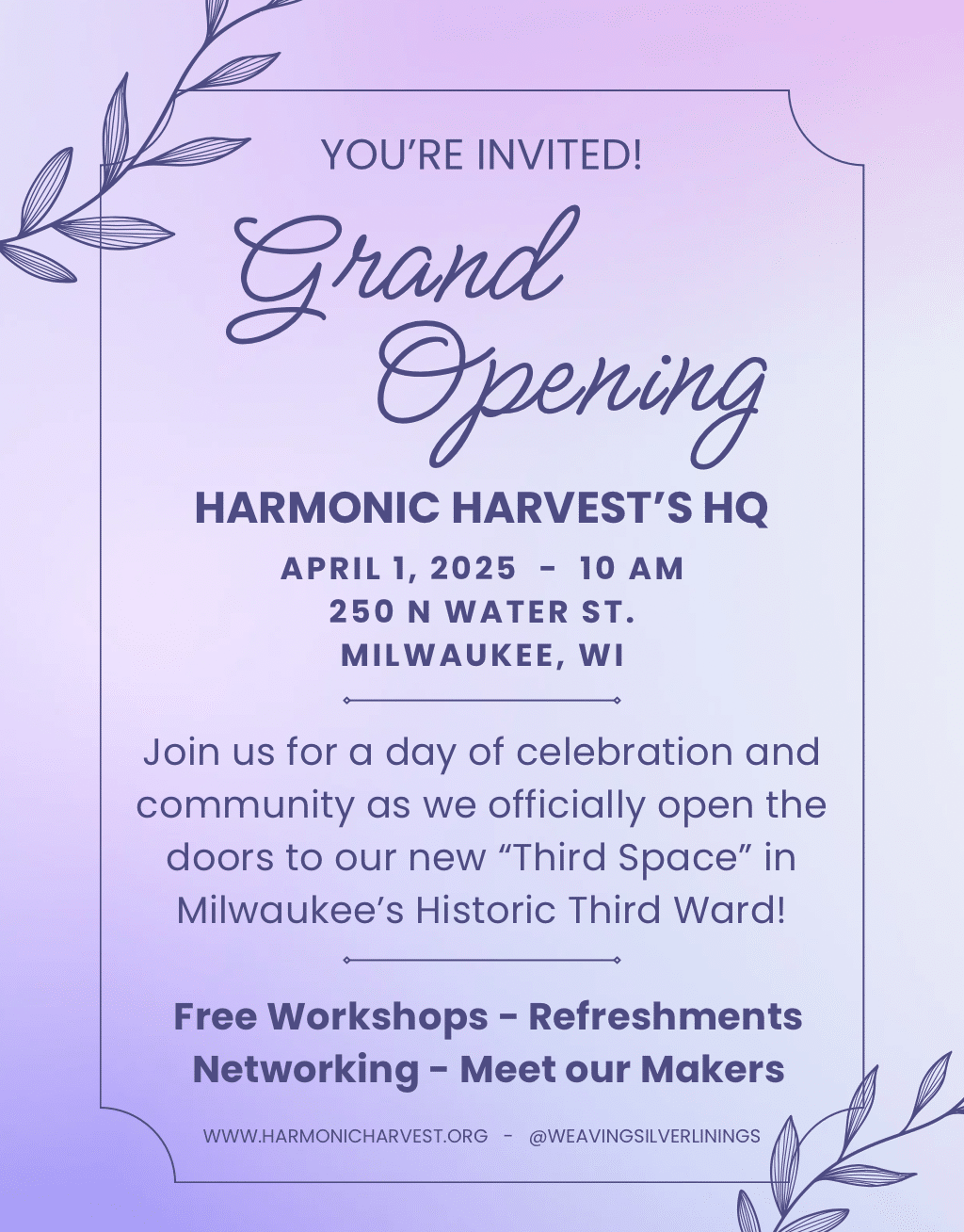 The wait is almost over! We are officially opening the doors to Harmonic Harvest's Headquarters and would love to celebrate this special moment with our valued community! Located in the Marshall Building in the Third Ward, our new “Third Space” location will be the home of our Renaissance Threads workshops, fundraising marketplace, atelier, art gallery […]